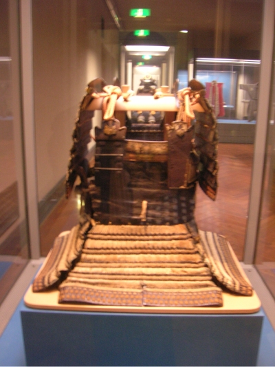前出の甲冑の鎖帷子の下が葛布らしい。ガラス越しですが、望遠鏡で必死こいて見つめること1時間余。葛布ではないかという予想ができました。