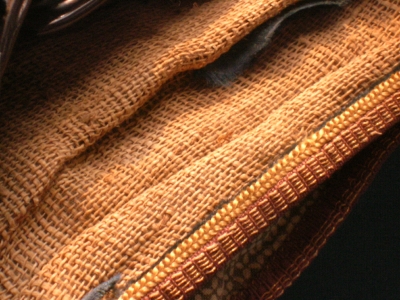 経糸が切れていて、平糸が飛び出ています。近くで見ることができないので はっきりしたことは言えないですが、他の植物繊維では見られない繊維の形状です。ほかの可能性があるとすれば紙を細く切ったもの。でも照明に当たって光っている様は葛の可能性の方が高い。葛らしい繊維の筋は確認できなかった。葛の平糸にしては糸の太さが整い過ぎているのも少し疑問ではある。