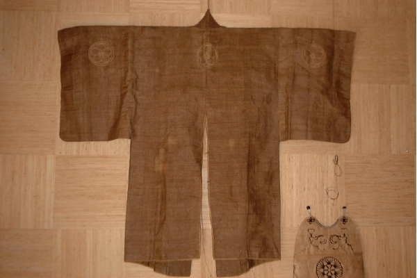 葛布の火消し装束 いわゆる 火事羽織である。徳川幕府の太平の世の中、戦乱もなく、武士階級がその働きを発揮するのは 火事のときしかなくなった。そのため陣羽織(鎧などの上に着る)が変化したようだ。火事のとき消化活動をする人の火消し装束は 厚地の綿に刺子をして 火をよけるように作ってあったが、火事羽織を着るような武士は後方で指揮をとっていたのではないかと思う。