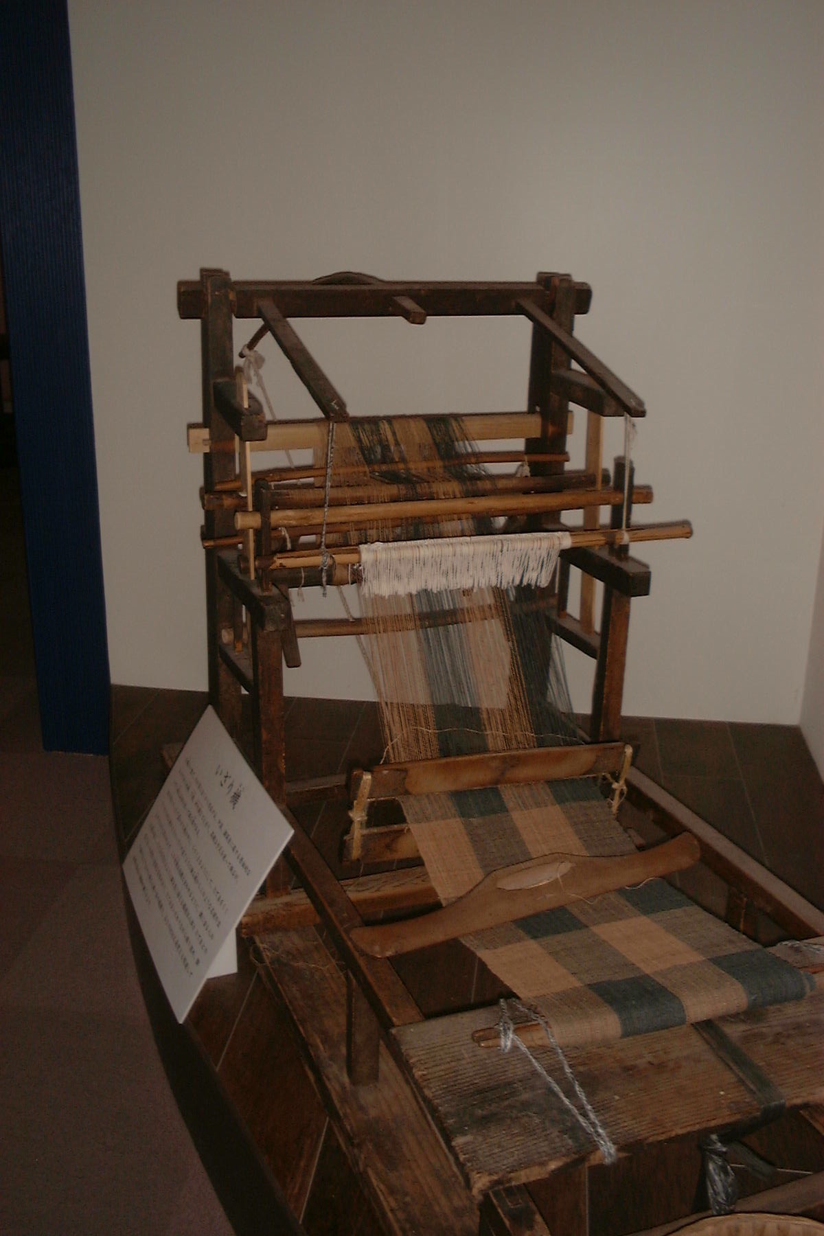ここでは機台腰機とよんでいるが、昔はイザリ機と呼ばれたものである。「いざり」というのが差別用語であるとして、最近では「地機」じばたといっている。