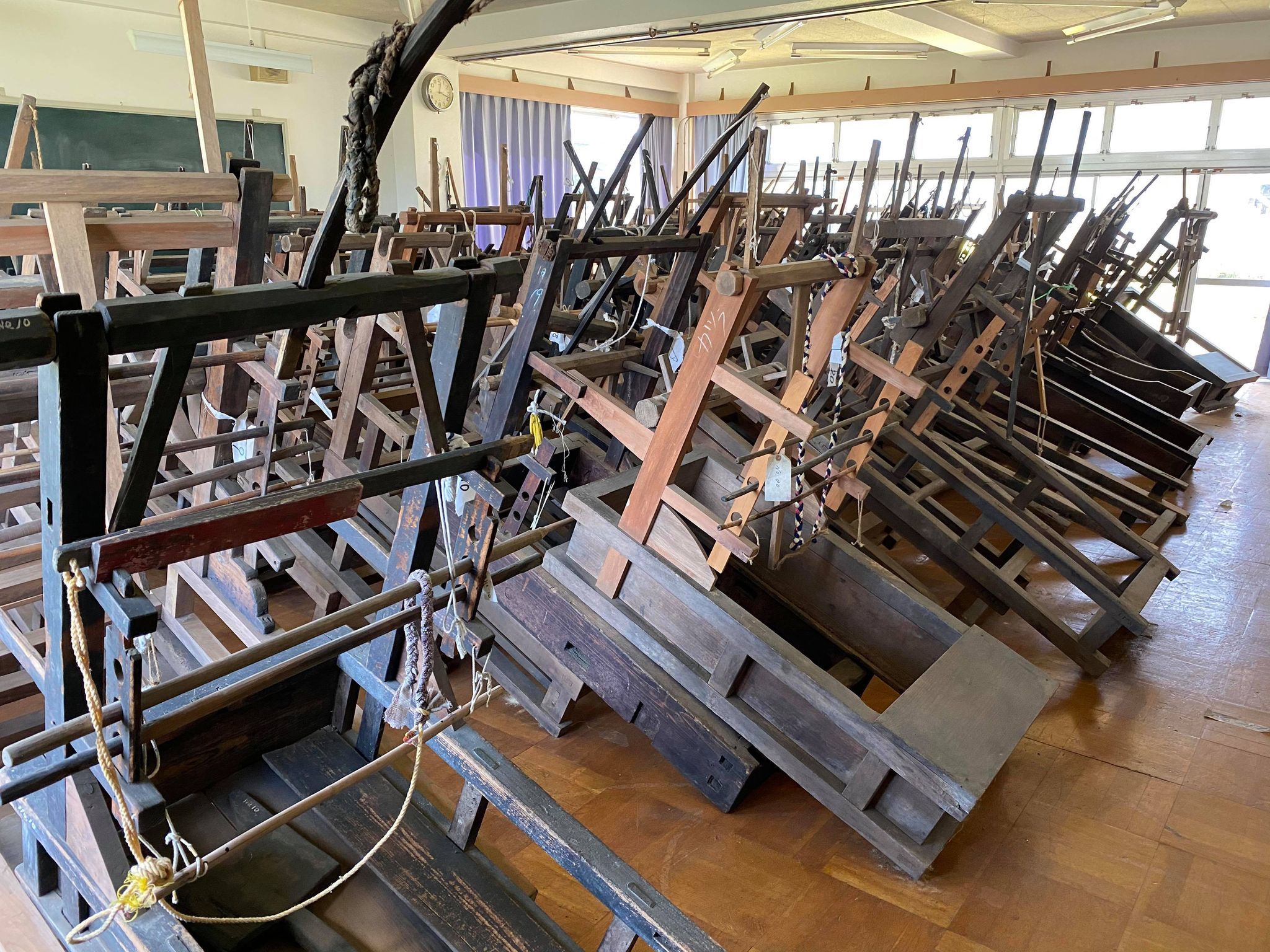 移設に前もって 古代織連絡会事務局長(大井川葛布織元)の村井龍彦が織り機、機料の調査を行い、トリアージを施して、今後使えるものを選定した。