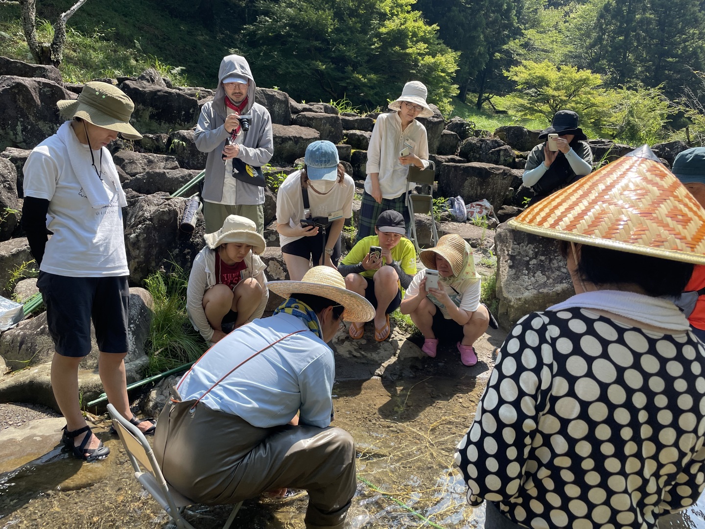葛洗い: 川に入ります。短パンもしくは水着、ゴム草履、長靴、帽子