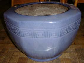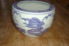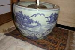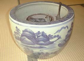 さて、その後、ギフトショー会場で火鉢を見つけました。山水画の火鉢大小2個組でなんと×,000円。早速初日一番で予約入れました。印判の染め付けで絵の出来は良くないのですが大きさが気に入りました。
