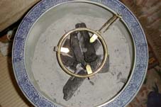 翌日には中国雑貨の店にまたもや火鉢。染め付けタコ柄の大小。なんと×,×00円。買うっきゃない!!と云うわけで 火鉢大小 4個を持ち帰りました。火鉢には灰が必需 最近ではホームセンターで灰も売っていますが、高い。そこで庭木の剪定したもの、染色材料のかすなどを燃やして灰を作りました。
