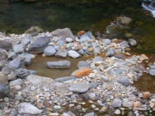 早速河原に降りてゆき、川底から泡とともに湧き出る温泉に足をつかりました。