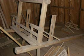 この機ははずしてあるが、本来は飛び杼である。間丁がとても短い。つり下げ框。