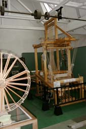 倉敷アイビースクエアーのクラボウ博物館に展示していた機。綜絖は2枚の糸綜絖、開口はろくろ式。