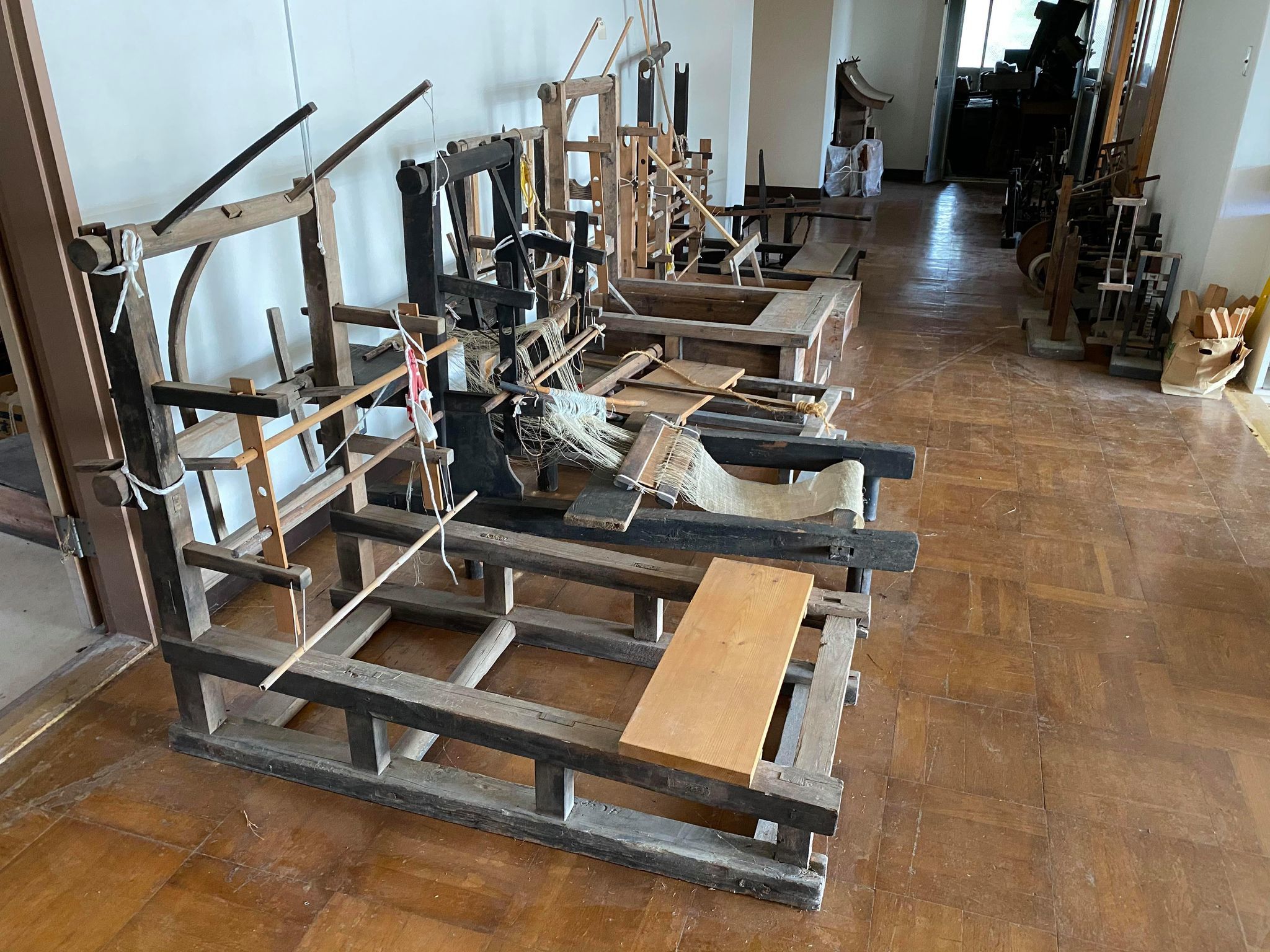 移設に前もって 古代織連絡会事務局長(大井川葛布織元)の村井龍彦が織り機、機料の調査を行い、トリアージを施して、今後使えるものを選定した。