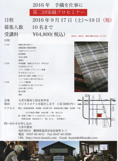 このセミナーを受けることで 開業準備万端というわけではありません。たかだか3日のセミナーですが、染織で生きていくために必要な知識 足りない知識が何なのか判ってもらうこと、染織で生きてゆく覚悟、そして手仕事の将来性などの をお伝えできればと思っています。