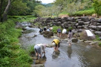 葛洗い: 川に入ります。短パンもしくは水着、ゴム草履、長靴、帽子