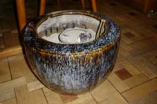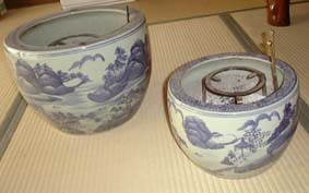 さて、その後、ギフトショー会場で火鉢を見つけました。山水画の火鉢大小2個組でなんと×,000円。早速初日一番で予約入れました。印判の染め付けで絵の出来は良くないのですが大きさが気に入りました。