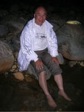 早速河原に降りてゆき、川底から泡とともに湧き出る温泉に足をつかりました。